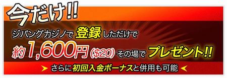 今なら登録だけで$20プレゼント特別キャンペーン中!ジパングカジノに登録。